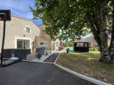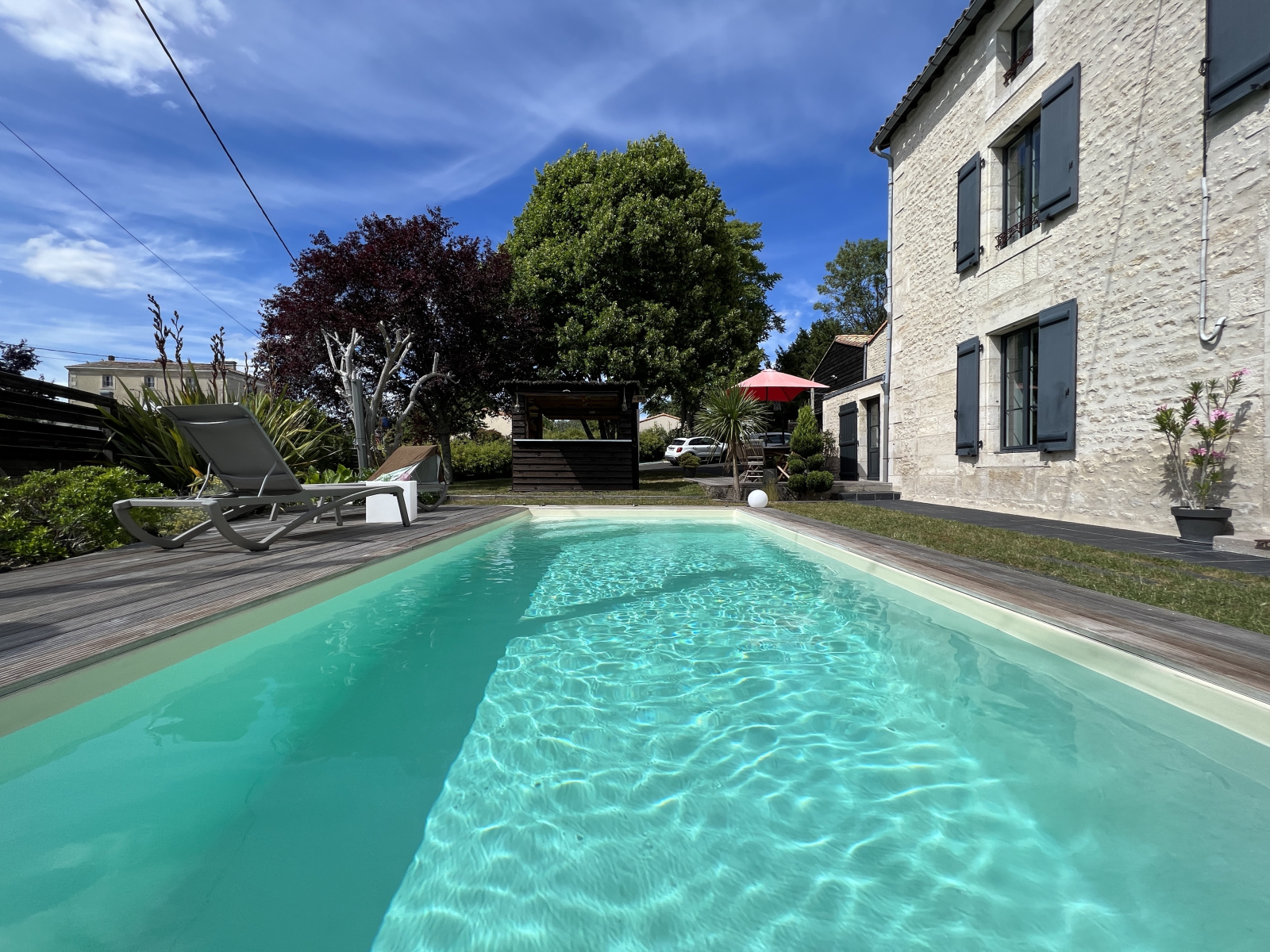 A l'extérieur, le terrain clos et arboré de 1159 m2 (cadastré) est agrémenté de terrasses, d'un petit bar extérieur, d'une piscine chauffée, d'un grand garage de 45 m2 pouvant contenir 2 voitures,d' un espace de stationnement en enrobé, et d'un préau.